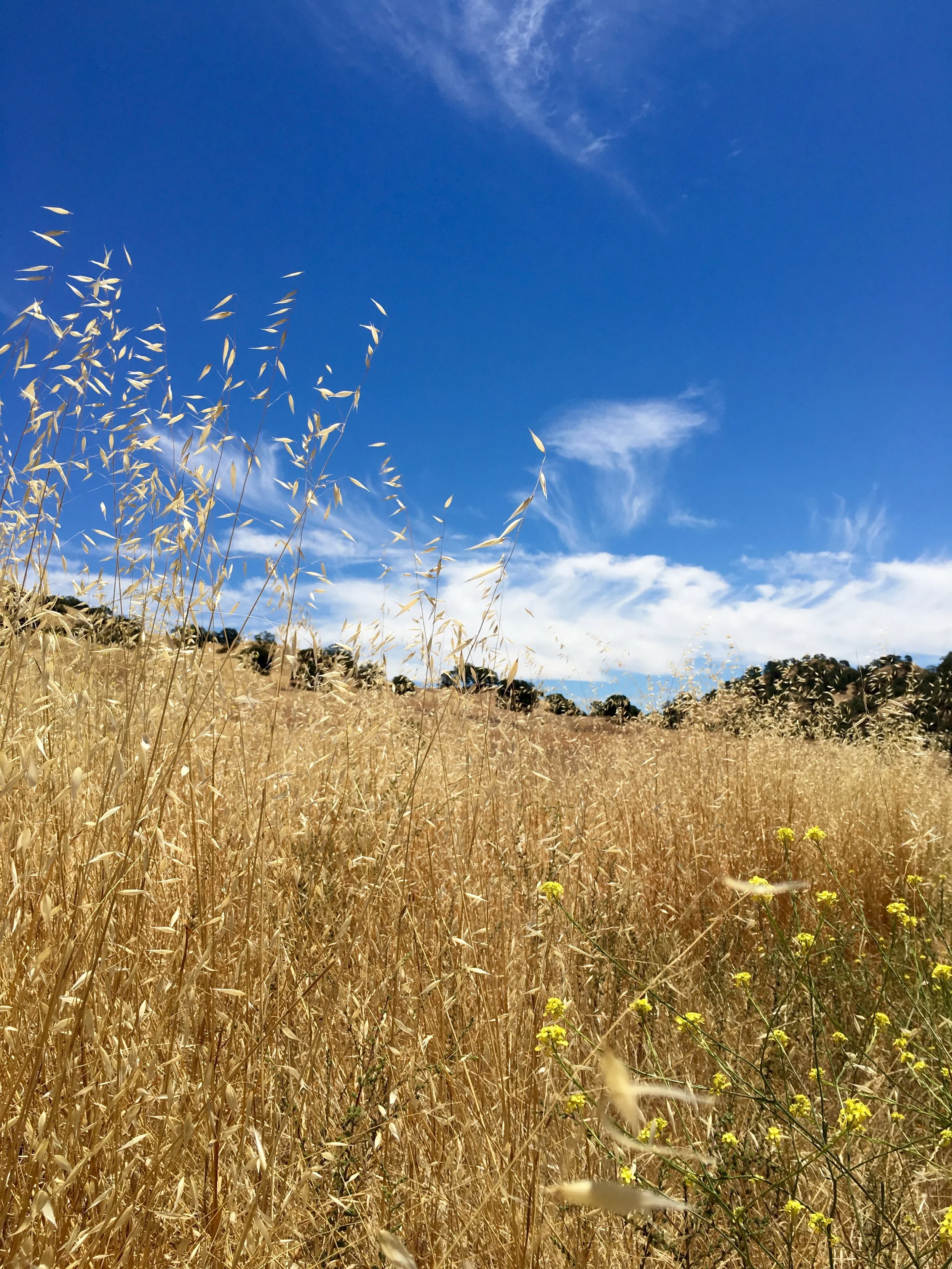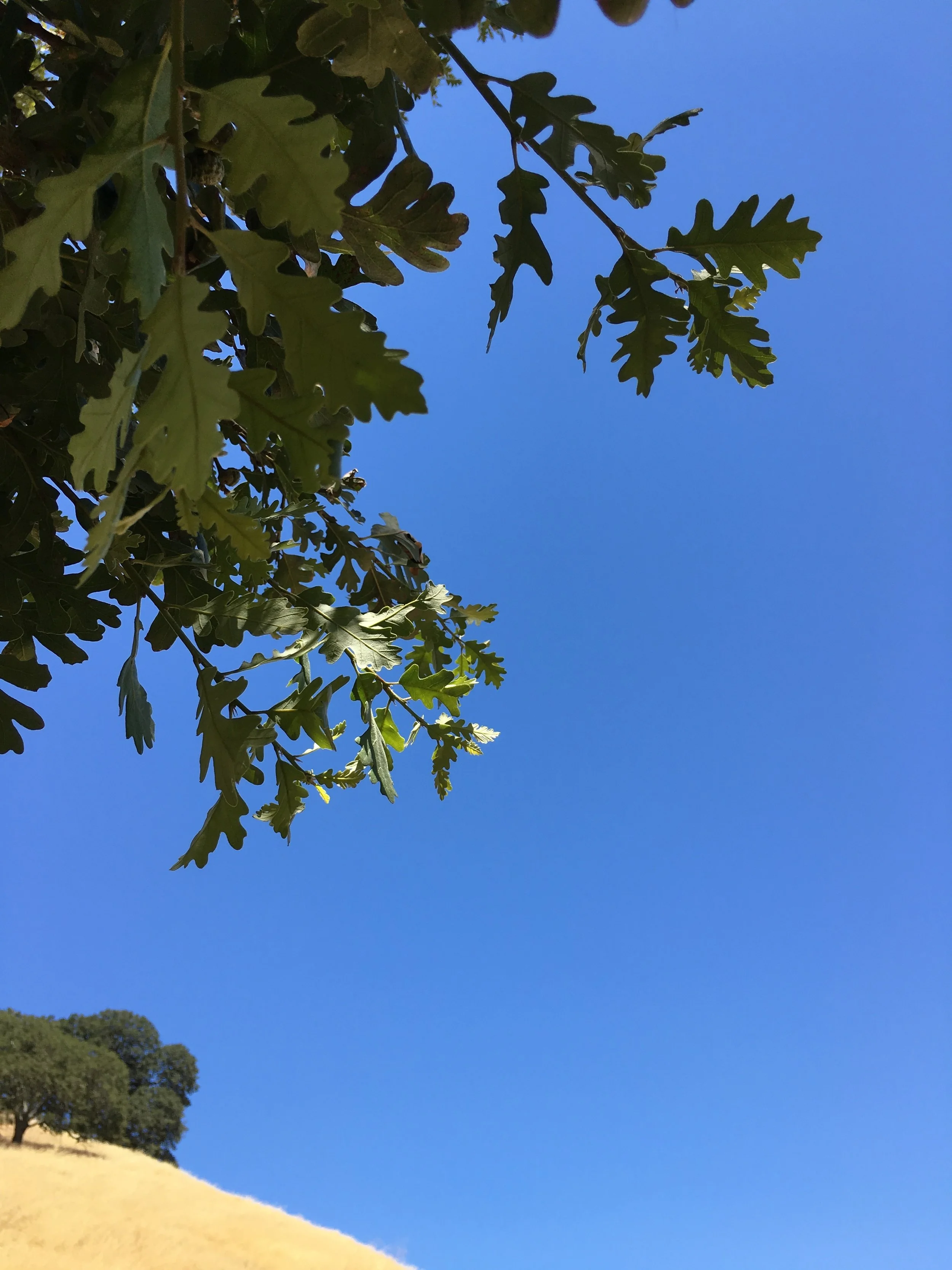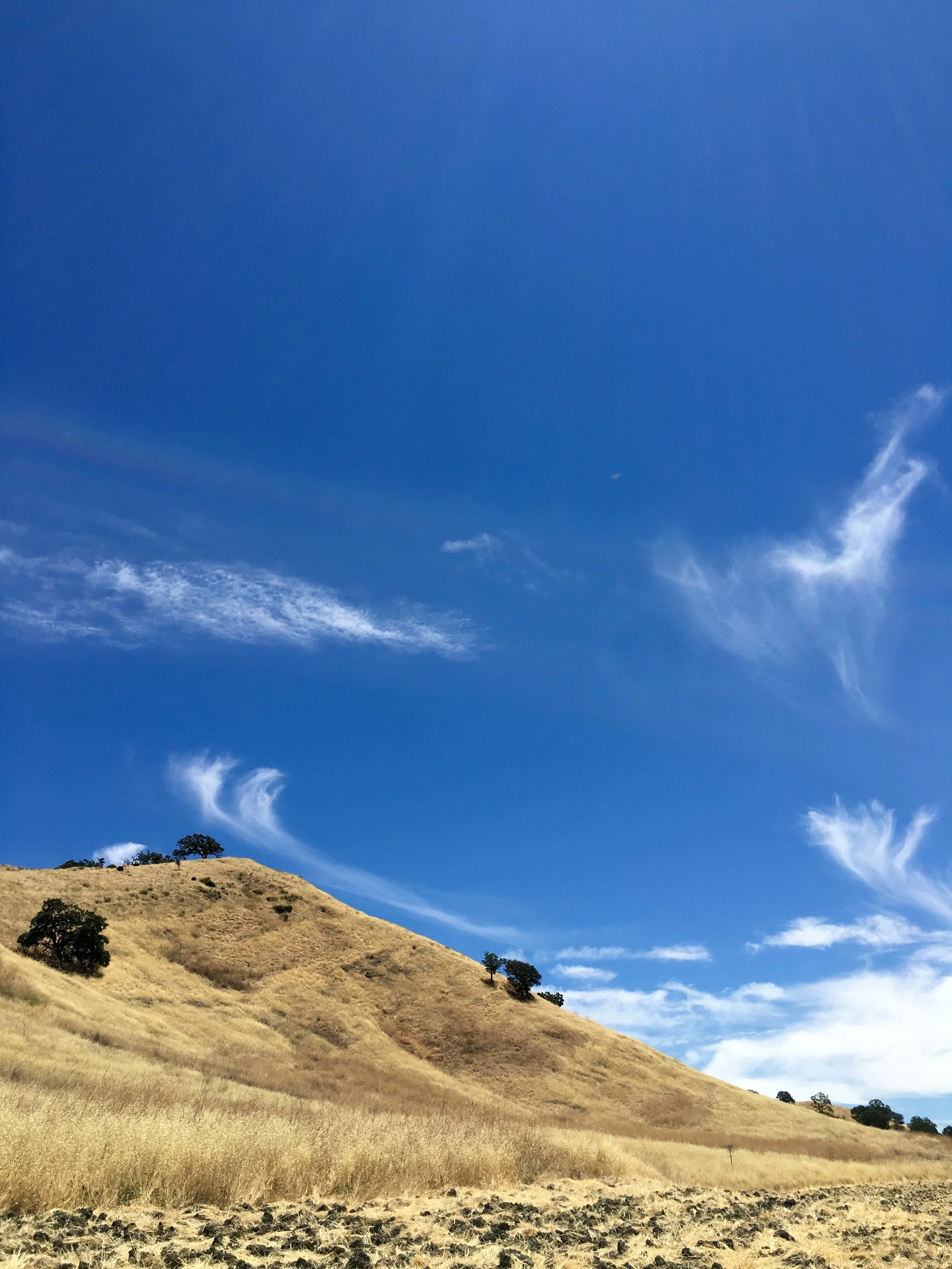 A different day, a different summer. This time the sky was pristine blue; the hills were golden yet again; the shaded creek bed had dried in the blistering heat. The pleasure of a Sunday drive. The joy of a morning hike up and down the soft flanks.. The bold blues and yellows; the wisps of soft white clouds. The proud oak trees standing guard.